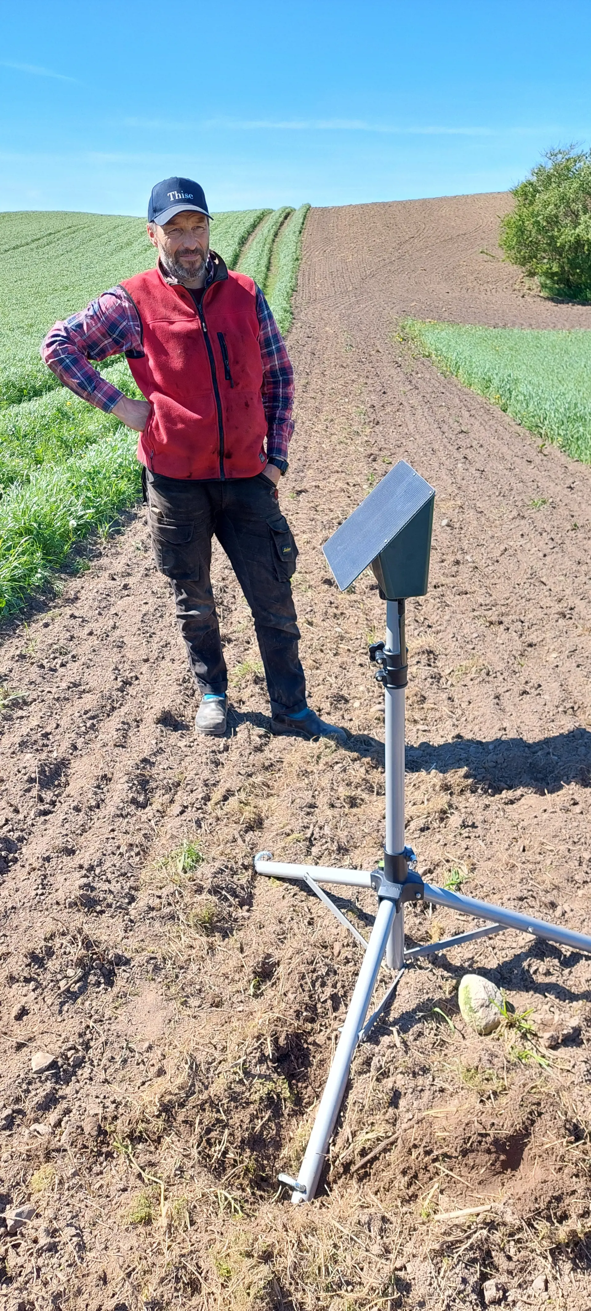 Det vil vi også gerne finde ud af, og derfor har vi sat biodiversitetssensorer op. Sensorerne kan registrere både flyvende insekter og insekter, der bevæger sig på jorden. Vi satte en sensor i ved hvert biodiversitetstiltag, der over en årrække vil måle, om der kommer flere insekter efterhånden som landmændenes træer, buske, blomster, urter og græsser vokser.