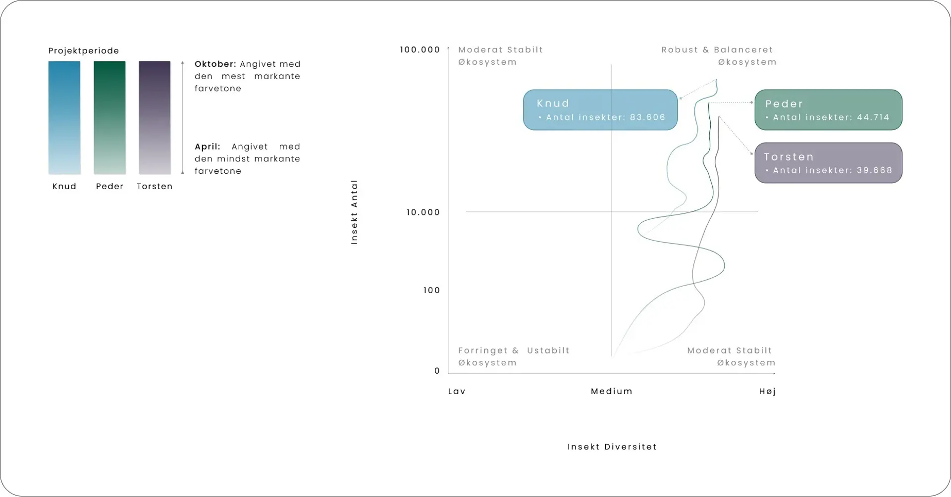 Vi har været med helt fra starten, da der blev gravet ud og sået planter. Sensorerne har derfor målt antallet af insekter helt fra begyndelsen og hen over den første sommer, der har været biodiversitetstiltag hos Torsten, Knud og Peder. Det bliver spændende at følge med i, hvor mange flere insekter, der kommer, når træer og buske vokser sig til større og flere dyr kan overvintre i området.