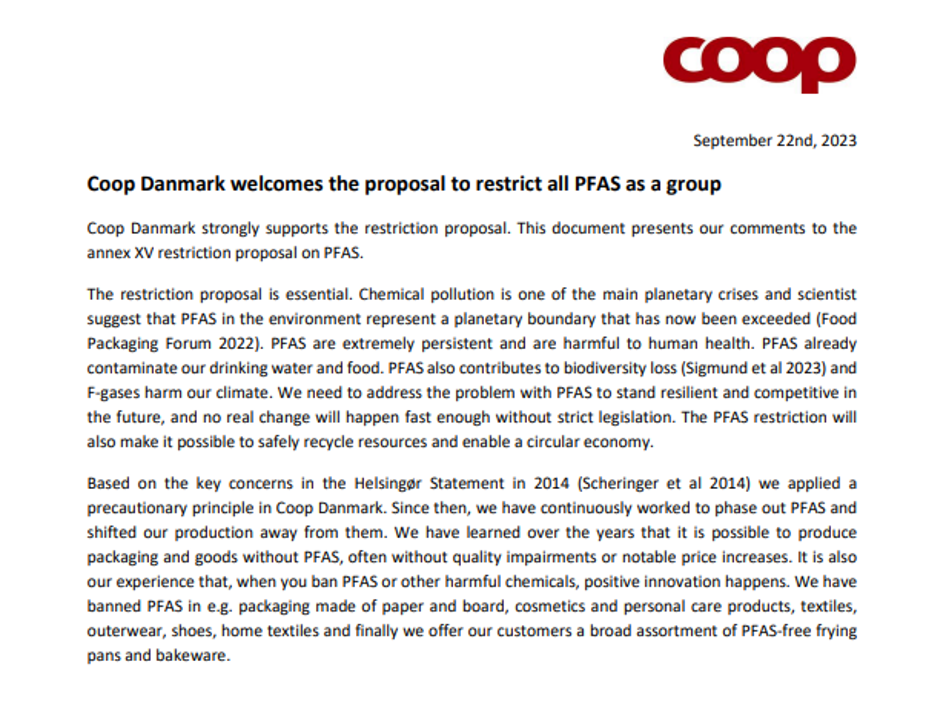 Med initiativet har Coop forbud mod PFAS i: Pap- og papiremballage, kosmetik- og plejeprodukter, tandtråd, gulvsæbe, tekstil, sko, boligtekstil, imprægneringsmidler, stegepander og bageartikler fra egne varemærker samt havehynder og parasoller.