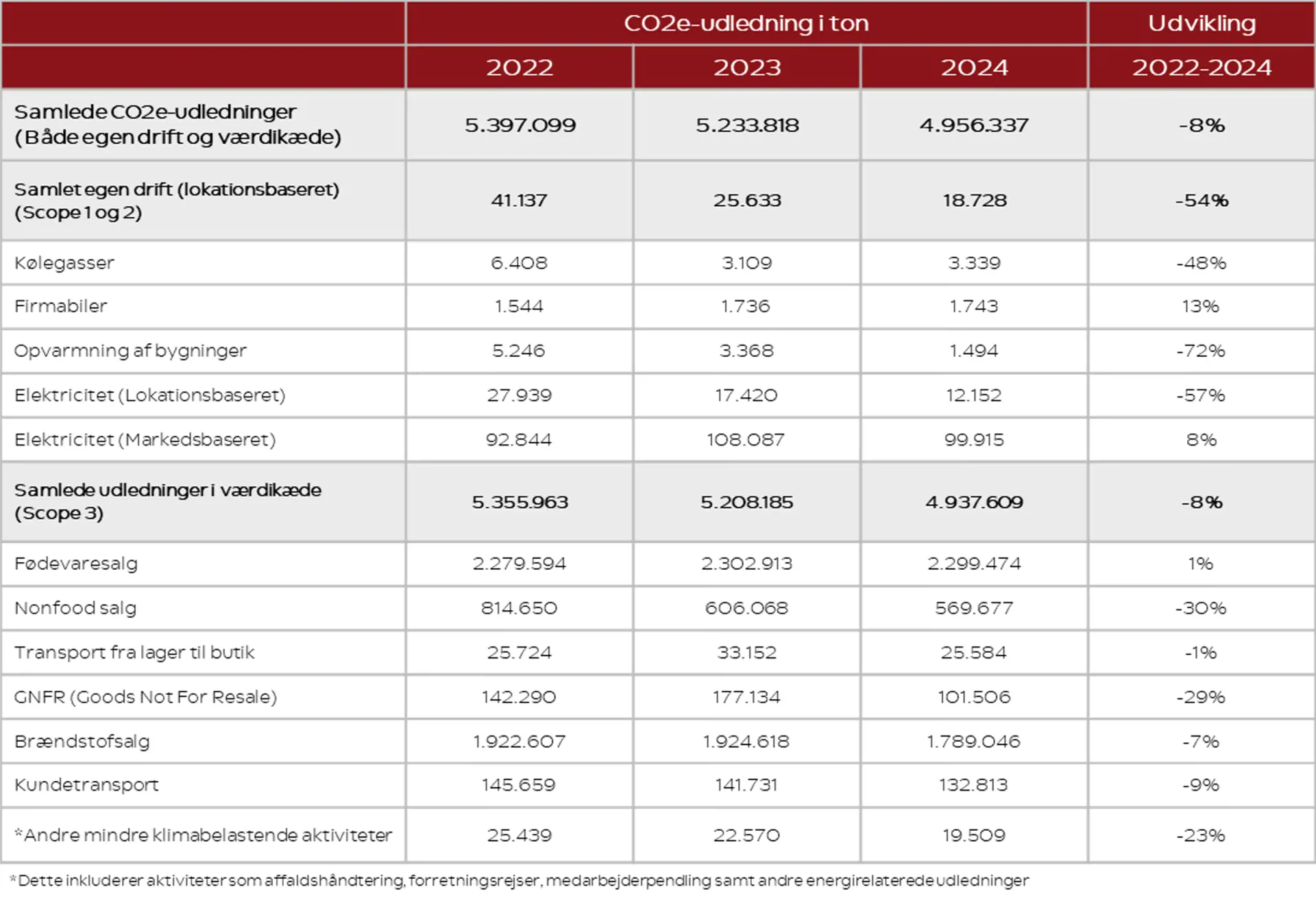 I tabellen herunder har vi kogt vores klimaregnskab ned til Coops centrale aktiviteter. De viser udviklingen i vores samlede klimapåvirkning fra 2022 til 2024. Bemærk, at det er alene 2024-tal, der er blevet revideret eksternt.