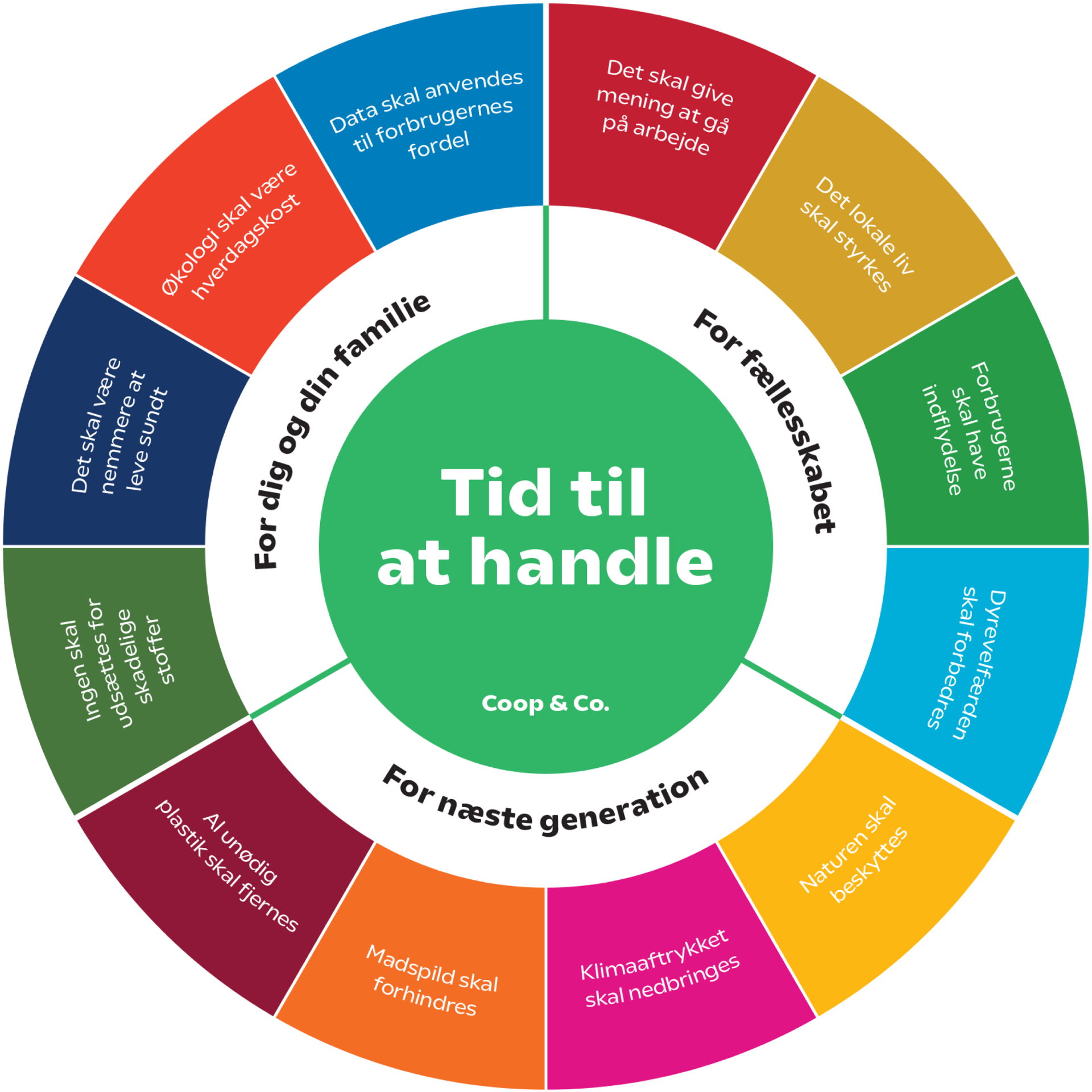 Derfor er Coops ansvarlighedsstrategi, Tid til at handle, også skabt sammen med vores kunder og knap 2 mio. medlemmer. For kun når vi handler sammen, kan vi sætte retningen for en grønnere og bedre fremtid.